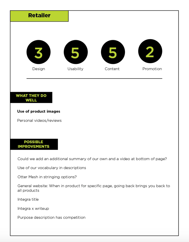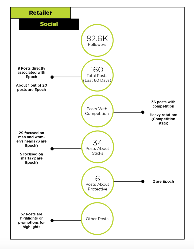 For my first project I conducted a thorough review of Epoch’s online retailers. The objective was to determine how well each company remained on brand with Epoch. Much of this document contains sensitive information, so this is a snapshot of the 30 page book. My job was to highlight the language used when promoting our products, while also assessing the functionality of the website. The online review also included an analysis of the retailer’s social media accounts and how well they promote Epoch compared to their competition.